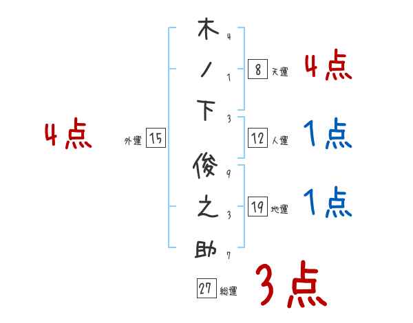 | 天運  | 木ノ下俊之助さんの天運は8画の4つ星!勤勉家。根気強く努力し成功する。忍耐力がある。家系が持つ宿命的な運勢を表します。祖先から受け継いだ苗字ですので自分の力が及びません。家柄を象徴します。 |