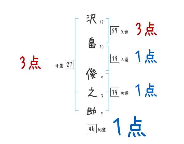 総運![]() | 沢畠俊之助さんの総運は46画の1つ星!迷走することが多く苦労するかも。目先のことにとらわれないように。 あなたの人生を表す1番重要な運勢です。生涯を通じて影響する総合運となり、主に50歳以降の晩年期に影響を及ぼします。 |