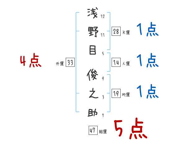 天運![]() | 浅野目俊之助さんの天運は28画の1つ星!家庭環境に注意。スポーツで活躍できる能力があるかも。 家系が持つ宿命的な運勢を表します。祖先から受け継いだ苗字ですので自分の力が及びません。家柄を象徴します。 |