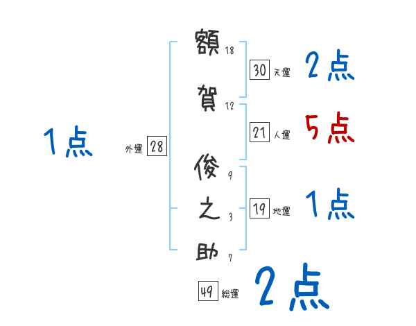 天運![]() | 額賀俊之助さんの天運は30画の2つ星!浮き沈みの激しさに注意しましょう。 家系が持つ宿命的な運勢を表します。祖先から受け継いだ苗字ですので自分の力が及びません。家柄を象徴します。 |