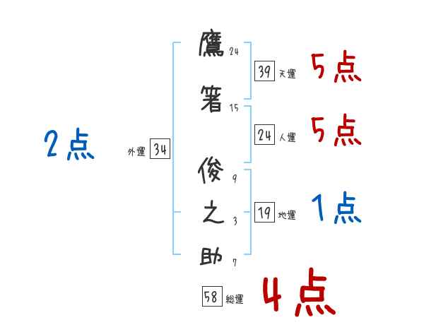 総運![]() | 鷹箸俊之助さんの総運は58画の4つ星!安定した生活。大器晩成タイプ。 あなたの人生を表す1番重要な運勢です。生涯を通じて影響する総合運となり、主に50歳以降の晩年期に影響を及ぼします。 |