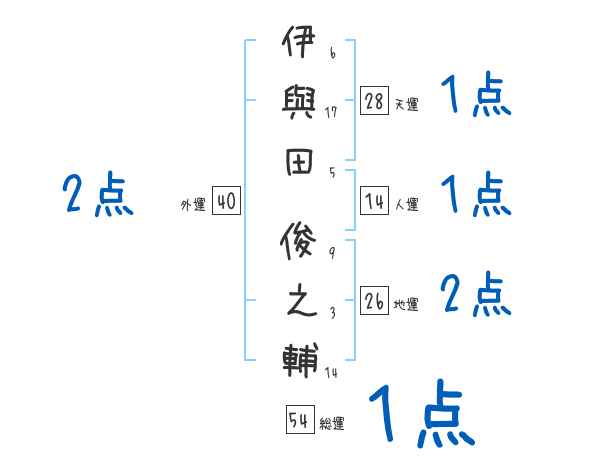 地運![]() | 伊與田俊之輔さんの地運は26画の2つ星!波瀾万丈かも。信頼できる人を大事にしましょう。 個性を表す基礎的な運勢です。性格形成や対人関係、行動力など家庭環境に影響されます。主に誕生してから20歳くらいまでの若年期の運勢を表します。 |