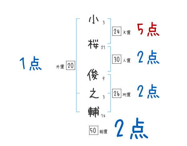 天運![]() | 小桜俊之輔さんの天運は24画の5つ星!家庭運が良く順調な人生。金運にも恵まれる。 家系が持つ宿命的な運勢を表します。祖先から受け継いだ苗字ですので自分の力が及びません。家柄を象徴します。 |