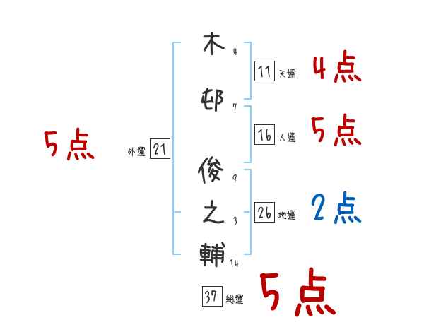 人運![]() | 木邨俊之輔さんの人運は16画の5つ星!人望が厚く大きく発展する。逆転成功が見える。 性格や才能などを表す2番目に重要な運勢です。人間関係や協調性、社会的な成功に影響します。主に20歳から50歳ぐらいまでの中年期の運勢を表します。 |