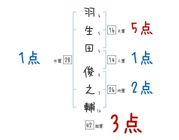 外運![]() | 羽生田俊之輔さんの外運は28画の1つ星!家庭環境に注意。スポーツで活躍できる能力があるかも。 生活面を象徴する運勢です。外部から受ける影響力を表し、結婚運、家庭運や職場、環境への順応性を表します。 |