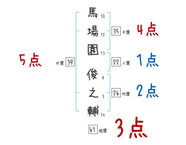 外運![]() | 馬場園俊之輔さんの外運は39画の5つ星!社交性に優れ人望が厚い。人の上に立ち成功する。 生活面を象徴する運勢です。外部から受ける影響力を表し、結婚運、家庭運や職場、環境への順応性を表します。 |