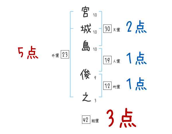 外運![]() | 宮城島俊之さんの外運は23画の5つ星!想像力に優れ活力がある。一代で成功し名誉を手に入れる。 生活面を象徴する運勢です。外部から受ける影響力を表し、結婚運、家庭運や職場、環境への順応性を表します。 |