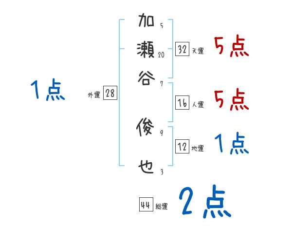 天運![]() | 加瀬谷俊也さんの天運は32画の5つ星!柔軟性があり成功する。チャンスが多く金運が良い。 家系が持つ宿命的な運勢を表します。祖先から受け継いだ苗字ですので自分の力が及びません。家柄を象徴します。 |