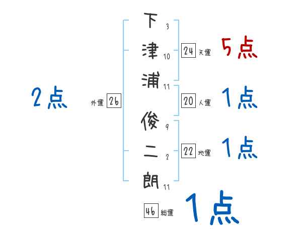 総運![]() | 下津浦俊二朗さんの総運は46画の1つ星!迷走することが多く苦労するかも。目先のことにとらわれないように。 あなたの人生を表す1番重要な運勢です。生涯を通じて影響する総合運となり、主に50歳以降の晩年期に影響を及ぼします。 |