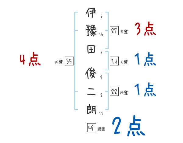 外運![]() | 伊豫田俊二朗さんの外運は35画の4つ星!温厚な性格で感受性が高い。穏和な性格で人望が厚い。 生活面を象徴する運勢です。外部から受ける影響力を表し、結婚運、家庭運や職場、環境への順応性を表します。 |