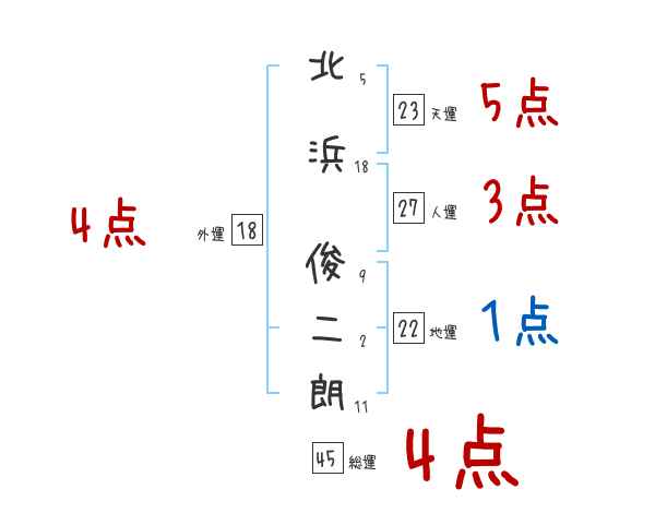 天運![]() | 北浜俊二朗さんの天運は23画の5つ星!想像力に優れ活力がある。一代で成功し名誉を手に入れる。 家系が持つ宿命的な運勢を表します。祖先から受け継いだ苗字ですので自分の力が及びません。家柄を象徴します。 |