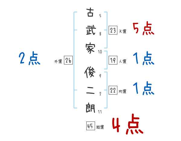 天運![]() | 古武家俊二朗さんの天運は23画の5つ星!想像力に優れ活力がある。一代で成功し名誉を手に入れる。 家系が持つ宿命的な運勢を表します。祖先から受け継いだ苗字ですので自分の力が及びません。家柄を象徴します。 |