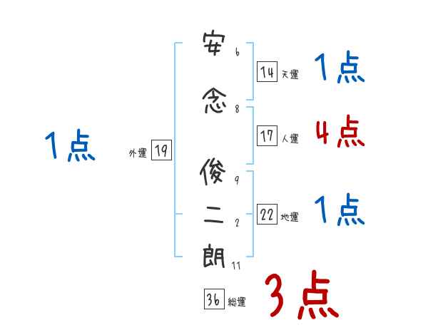 外運![]() | 安念俊二朗さんの外運は19画の1つ星!優れた才能を持ちますが、協調性が足りないことも。周りの人と協力する事を意識しましょう。 生活面を象徴する運勢です。外部から受ける影響力を表し、結婚運、家庭運や職場、環境への順応性を表します。 |