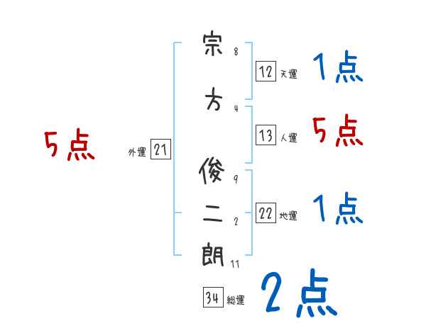 外運![]() | 宗方俊二朗さんの外運は21画の5つ星!統率力がある。独立し成功する。名誉を手に入れる。 生活面を象徴する運勢です。外部から受ける影響力を表し、結婚運、家庭運や職場、環境への順応性を表します。 |