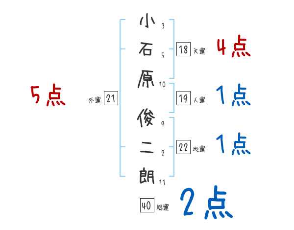 外運![]() | 小石原俊二朗さんの外運は21画の5つ星!統率力がある。独立し成功する。名誉を手に入れる。 生活面を象徴する運勢です。外部から受ける影響力を表し、結婚運、家庭運や職場、環境への順応性を表します。 |
