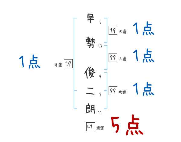 天運![]() | 早勢俊二朗さんの天運は19画の1つ星!優れた才能を持ちますが、協調性が足りないことも。周りの人と協力する事を意識しましょう。 家系が持つ宿命的な運勢を表します。祖先から受け継いだ苗字ですので自分の力が及びません。家柄を象徴します。 |