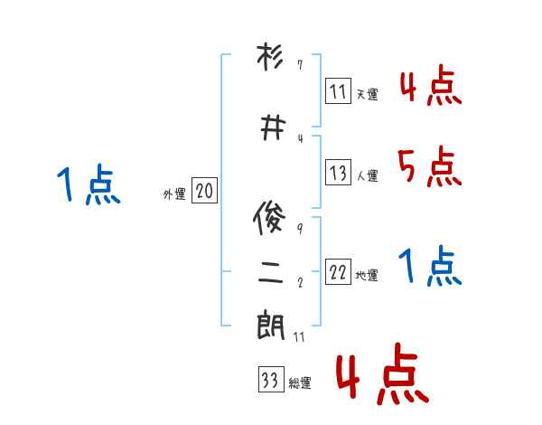 天運![]() | 杉井俊二朗さんの天運は11画の4つ星!着実に富や地位を得る幸運な人生。 家系が持つ宿命的な運勢を表します。祖先から受け継いだ苗字ですので自分の力が及びません。家柄を象徴します。 |