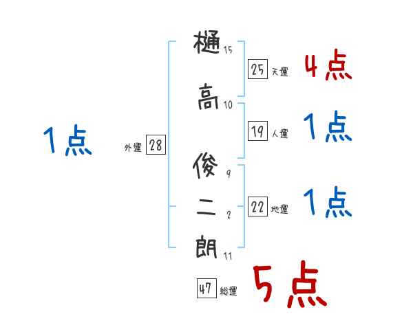 総運![]() | 樋高俊二朗さんの総運は47画の5つ星!実力が開花し発展する円満な人生。財に恵まれる。 あなたの人生を表す1番重要な運勢です。生涯を通じて影響する総合運となり、主に50歳以降の晩年期に影響を及ぼします。 |