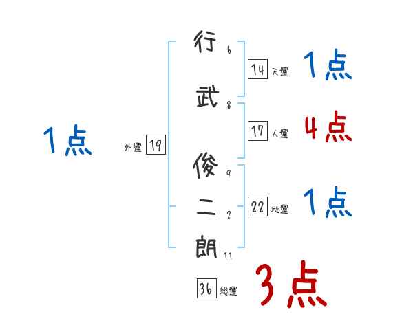総運![]() | 行武俊二朗さんの総運は36画の3つ星!先見性が豊かです。多少神経質で苦労することも。 あなたの人生を表す1番重要な運勢です。生涯を通じて影響する総合運となり、主に50歳以降の晩年期に影響を及ぼします。 |