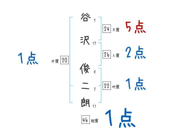 総運![]() | 谷沢俊二朗さんの総運は46画の1つ星!迷走することが多く苦労するかも。目先のことにとらわれないように。 あなたの人生を表す1番重要な運勢です。生涯を通じて影響する総合運となり、主に50歳以降の晩年期に影響を及ぼします。 |