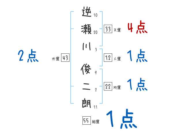 天運![]() | 逆瀬川俊二朗さんの天運は33画の4つ星!権力志向でプライドが高い。勇気があり運を切り開き成功する。 家系が持つ宿命的な運勢を表します。祖先から受け継いだ苗字ですので自分の力が及びません。家柄を象徴します。 |
