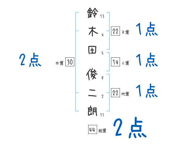 総運![]() | 鈴木田俊二朗さんの総運は44画の2つ星!誠実で慎重な性格。物事を考えすぎないように注意しましょう。 あなたの人生を表す1番重要な運勢です。生涯を通じて影響する総合運となり、主に50歳以降の晩年期に影響を及ぼします。 |