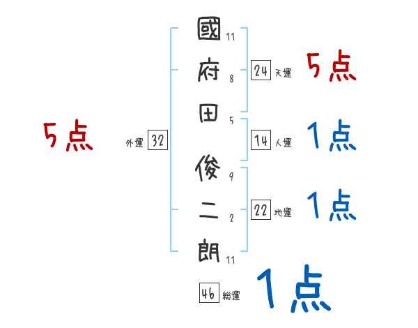 外運![]() | 國府田俊二朗さんの外運は32画の5つ星!柔軟性があり成功する。チャンスが多く金運が良い。 生活面を象徴する運勢です。外部から受ける影響力を表し、結婚運、家庭運や職場、環境への順応性を表します。 |