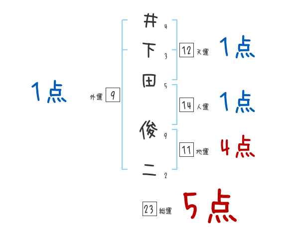 総運![]() | 井下田俊二さんの総運は23画の5つ星!想像力に優れ活力がある。一代で成功し名誉を手に入れる。 あなたの人生を表す1番重要な運勢です。生涯を通じて影響する総合運となり、主に50歳以降の晩年期に影響を及ぼします。 |