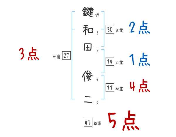 外運![]() | 鍵和田俊二さんの外運は27画の3つ星!頭脳明晰だが強情で摩擦が多い傾向。孤立に注意。 生活面を象徴する運勢です。外部から受ける影響力を表し、結婚運、家庭運や職場、環境への順応性を表します。 |
