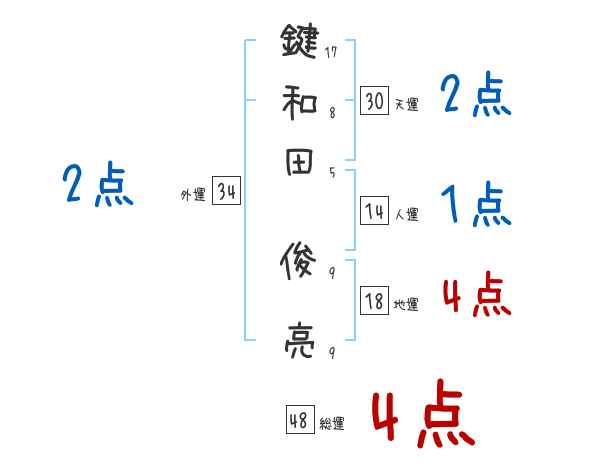 天運![]() | 鍵和田俊亮さんの天運は30画の2つ星!浮き沈みの激しさに注意しましょう。 家系が持つ宿命的な運勢を表します。祖先から受け継いだ苗字ですので自分の力が及びません。家柄を象徴します。 |
