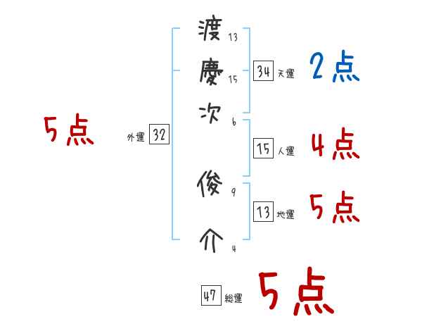 外運![]() | 渡慶次俊介さんの外運は32画の5つ星!柔軟性があり成功する。チャンスが多く金運が良い。 生活面を象徴する運勢です。外部から受ける影響力を表し、結婚運、家庭運や職場、環境への順応性を表します。 |