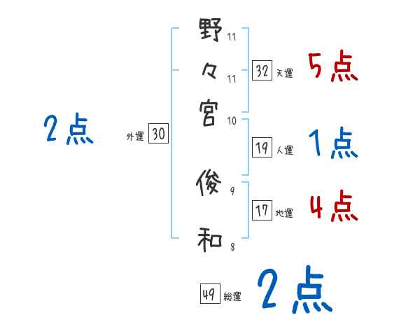 天運![]() | 野々宮俊和さんの天運は32画の5つ星!柔軟性があり成功する。チャンスが多く金運が良い。 家系が持つ宿命的な運勢を表します。祖先から受け継いだ苗字ですので自分の力が及びません。家柄を象徴します。 |