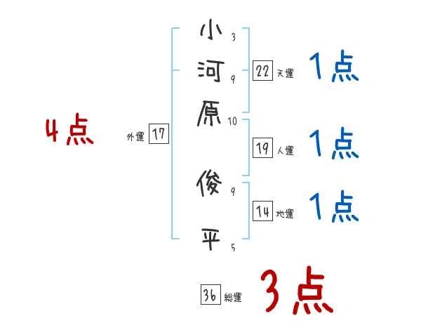 総運![]() | 小河原俊平さんの総運は36画の3つ星!先見性が豊かです。多少神経質で苦労することも。 あなたの人生を表す1番重要な運勢です。生涯を通じて影響する総合運となり、主に50歳以降の晩年期に影響を及ぼします。 |