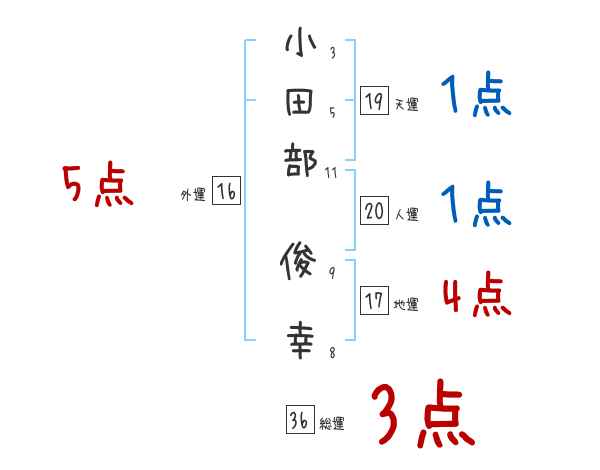 総運![]() | 小田部俊幸さんの総運は36画の3つ星!先見性が豊かです。多少神経質で苦労することも。 あなたの人生を表す1番重要な運勢です。生涯を通じて影響する総合運となり、主に50歳以降の晩年期に影響を及ぼします。 |