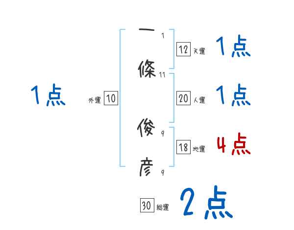 天運![]() | 一條俊彦さんの天運は12画の1つ星!簡単な失敗で諦めてしまいやすいかも。着実に行動すると良いでしょう。 家系が持つ宿命的な運勢を表します。祖先から受け継いだ苗字ですので自分の力が及びません。家柄を象徴します。 |