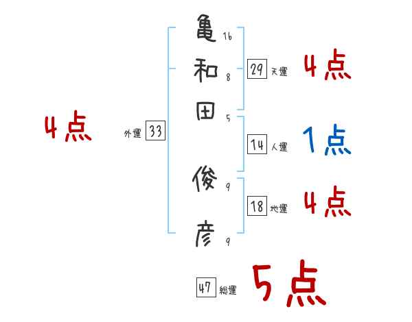 総運![]() | 亀和田俊彦さんの総運は47画の5つ星!実力が開花し発展する円満な人生。財に恵まれる。 あなたの人生を表す1番重要な運勢です。生涯を通じて影響する総合運となり、主に50歳以降の晩年期に影響を及ぼします。 |