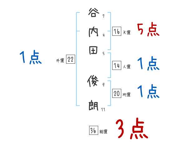外運![]() | 谷内田俊朗さんの外運は22画の1つ星!努力することが苦手ないっぽう手先が器用。芸術性にも優れる。 生活面を象徴する運勢です。外部から受ける影響力を表し、結婚運、家庭運や職場、環境への順応性を表します。 |