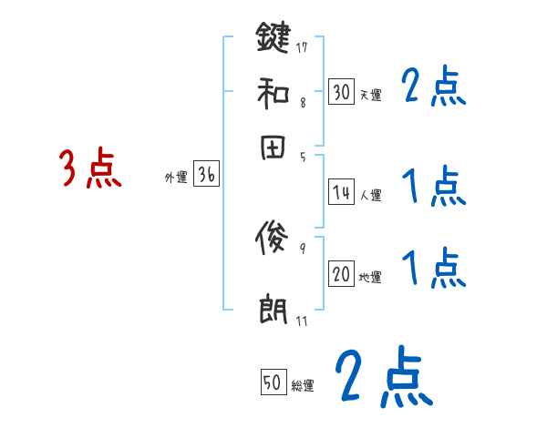 外運![]() | 鍵和田俊朗さんの外運は36画の3つ星!先見性が豊かです。多少神経質で苦労することも。 生活面を象徴する運勢です。外部から受ける影響力を表し、結婚運、家庭運や職場、環境への順応性を表します。 |
