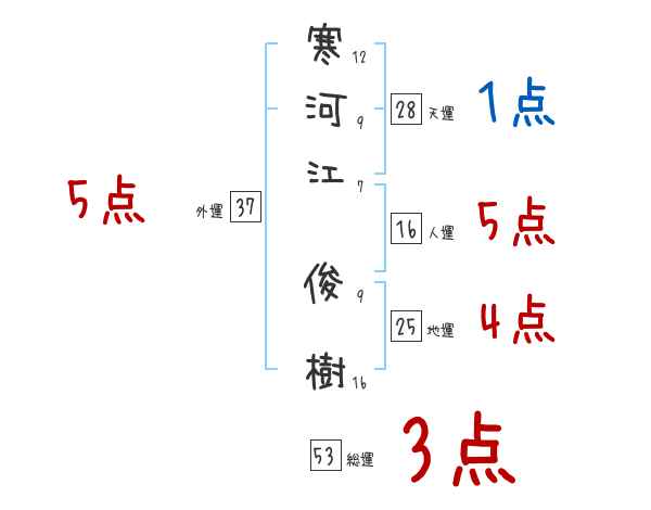 総運![]() | 寒河江俊樹さんの総運は53画の3つ星!やや見栄っ張りで虚栄心がある。散財に注意。 あなたの人生を表す1番重要な運勢です。生涯を通じて影響する総合運となり、主に50歳以降の晩年期に影響を及ぼします。 |