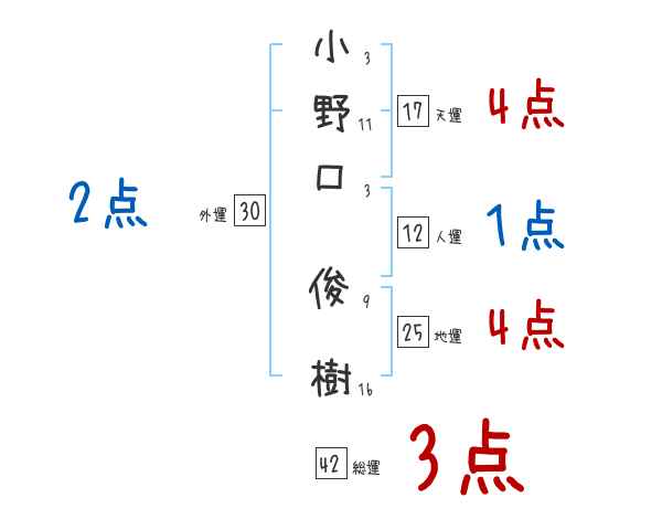 外運![]() | 小野口俊樹さんの外運は30画の2つ星!浮き沈みの激しさに注意しましょう。 生活面を象徴する運勢です。外部から受ける影響力を表し、結婚運、家庭運や職場、環境への順応性を表します。 |
