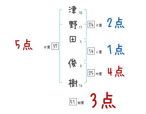 総運![]() | 津野田俊樹さんの総運は51画の3つ星!変化が激しく、危険に注意。堅実な性格。 あなたの人生を表す1番重要な運勢です。生涯を通じて影響する総合運となり、主に50歳以降の晩年期に影響を及ぼします。 |