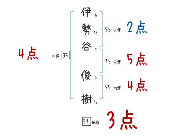 外運![]() | 伊勢谷俊樹さんの外運は35画の4つ星!温厚な性格で感受性が高い。穏和な性格で人望が厚い。 生活面を象徴する運勢です。外部から受ける影響力を表し、結婚運、家庭運や職場、環境への順応性を表します。 |