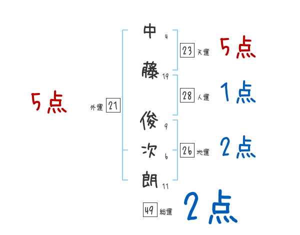 天運![]() | 中藤俊次朗さんの天運は23画の5つ星!想像力に優れ活力がある。一代で成功し名誉を手に入れる。 家系が持つ宿命的な運勢を表します。祖先から受け継いだ苗字ですので自分の力が及びません。家柄を象徴します。 |