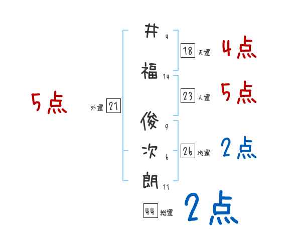 外運![]() | 井福俊次朗さんの外運は21画の5つ星!統率力がある。独立し成功する。名誉を手に入れる。 生活面を象徴する運勢です。外部から受ける影響力を表し、結婚運、家庭運や職場、環境への順応性を表します。 |