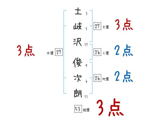 外運![]() | 土岐沢俊次朗さんの外運は27画の3つ星!頭脳明晰だが強情で摩擦が多い傾向。孤立に注意。 生活面を象徴する運勢です。外部から受ける影響力を表し、結婚運、家庭運や職場、環境への順応性を表します。 |
