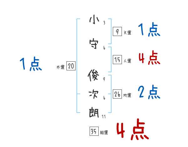 総運![]() | 小守俊次朗さんの総運は35画の4つ星!温厚な性格で感受性が高い。穏和な性格で人望が厚い。 あなたの人生を表す1番重要な運勢です。生涯を通じて影響する総合運となり、主に50歳以降の晩年期に影響を及ぼします。 |
