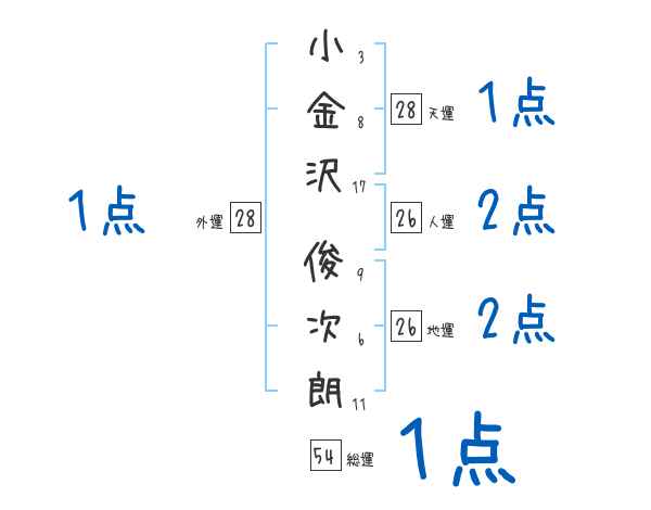 天運![]() | 小金沢俊次朗さんの天運は28画の1つ星!家庭環境に注意。スポーツで活躍できる能力があるかも。 家系が持つ宿命的な運勢を表します。祖先から受け継いだ苗字ですので自分の力が及びません。家柄を象徴します。 |