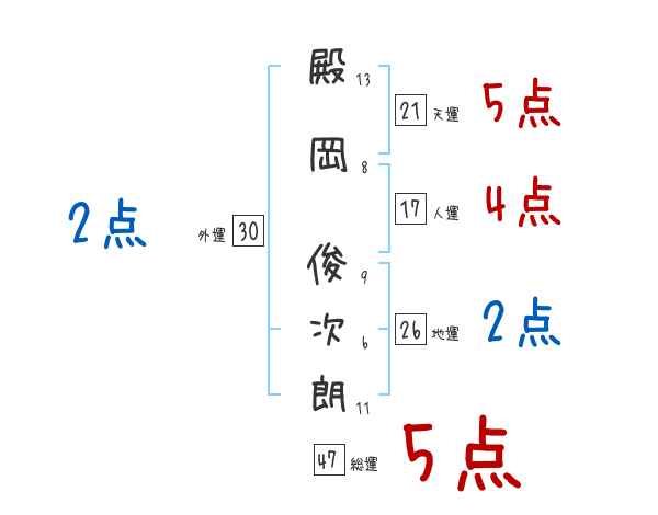 天運![]() | 殿岡俊次朗さんの天運は21画の5つ星!統率力がある。独立し成功する。名誉を手に入れる。 家系が持つ宿命的な運勢を表します。祖先から受け継いだ苗字ですので自分の力が及びません。家柄を象徴します。 |