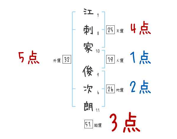 江刺家俊次朗さんの画数の鑑定結果