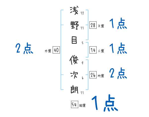 天運![]() | 浅野目俊次朗さんの天運は28画の1つ星!家庭環境に注意。スポーツで活躍できる能力があるかも。 家系が持つ宿命的な運勢を表します。祖先から受け継いだ苗字ですので自分の力が及びません。家柄を象徴します。 |